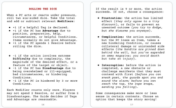 - No true failure: every dice roll keeps the action moving; the question is never "will the PCs succeed?", but "what will the PCs sacrifice to get what they want?"