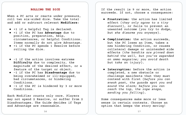 - 2d6 resolution: ubiquitous dice with a bell curve that results in tense and dynamic narratives, plus some elegant twists to make things interesting.
