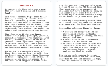 - Freeform Tag character creation: lets you decide what is important about your PC, and puts you on equal footing with others for everything else.